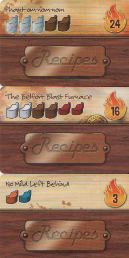 In a 3-player game there will be 12 of these recipes chosen randomly and lined up along the board’s edge. Will you go for quantity, quality or a combination? Note the victory point values in the upper-right corners.