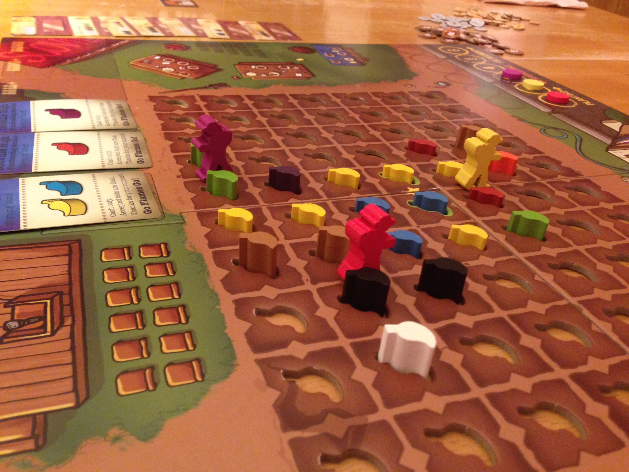 There are just a few things I didn’t like, but these had nothing to do with the mechanics. The cardboard coins are a bit too dainty for my man hands, the largest denomination being only slightly larger than a dime. Also, the very cool farmer meeples were a little unsteady when resting on the creases between the four boards that comprise the playing surface. There is a very slight warping of the boards where they meet in the middle. Finally, as I mentioned above, there are not enough cross breeding charts to go around in larger games.