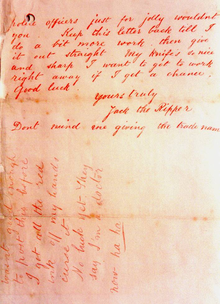 I keep on hearing the police have caught me but they wont fix me just yet. I have laughed when they look so clever and talk about being on the right track. That joke about Leather Apron gave me real fits. I am down on whores and I shant quit ripping them till I do get buckled. Grand work the last job was. I gave the lady no time to squeal. How can they catch me now. I love my work and want to start again. You will soon hear of me with my funny little games. I saved some of the proper red stuff in a ginger beer bottle over the last job to write with but it went thick like glue and I cant use it. Red ink is fit enough I hope ha. ha. The next job I do I shall clip the ladys ears off and send to the police officers just for jolly wouldn’t you. Keep this letter back till I do a bit more work, then give it out straight. My knife’s so nice and sharp I want to get to work right away if I get a chance. Good Luck. Yours truly
