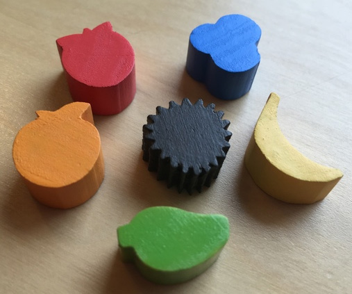 Here is where things get frantic and crazy fun. Everyone picks up their die and begins rolling. With each die roll, you may grab a wooden fruit that matches your roll, and place it on one of your blender cards, or grab the one of your choice when you roll a question mark. You’re doing this because you have your eye on the prize, one or more of the orders in the middle of the table. Fulfill an order exactly, and you grab the order card and replace it with another. All players continue rolling, completing orders until the deck runs dry and the last order is done! The person with the most stars wins.
