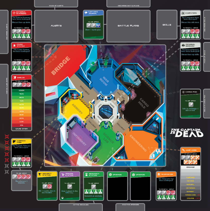 As you move about the ship, The Captain Is Dead is about optimizing the entire crew each turn, sending people to locations where they will be most useful, restocking hands of Skill cards, activating and using undamaged locations, repairing broken systems and shields, destroying enemy ships and slowly but surely repairing the Jump Core.